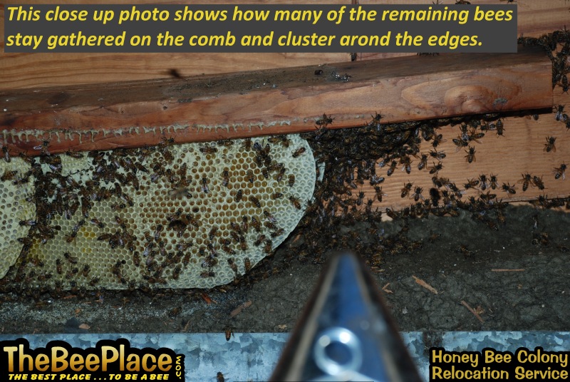 To relocate the bees alive, we carefully removed the comb in sections, including the brood and the honey and place the sections of comb in special frames that fit into a wooden box for transport. Many of the worker bees form clusters around the hive area, in holes and crevices on the inside of the wall. These are vacuumed into the lower section of the BeeVac and held there safely out of harms way. |