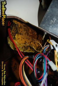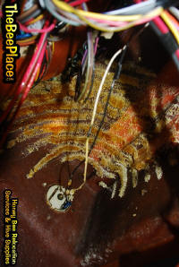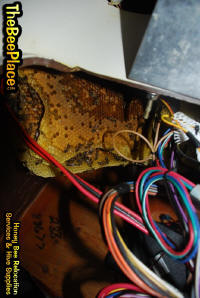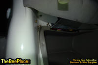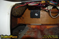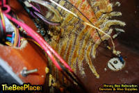 To relocate the bees alive, we carefully removed the comb in sections, including the brood and the honey and place the sections of comb in special frames that fit into a wooden box for transport. Many of the worker bees form clusters around the hive area, in holes and crevices on the inside of the wall. These are vacuumed into the lower section of the BeeVac and held there safely out of harms way. |