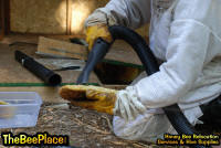 To relocate the bees alive, we carefully removed the comb in sections, including the brood and the honey and place the sections of comb in special frames that fit into a wooden box for transport. Many of the worker bees form clusters around the hive area, in holes and crevices on the inside of the wall. These are vacuumed into the lower section of the BeeVac and held there safely out of harms way. |