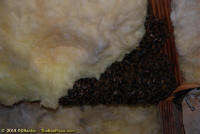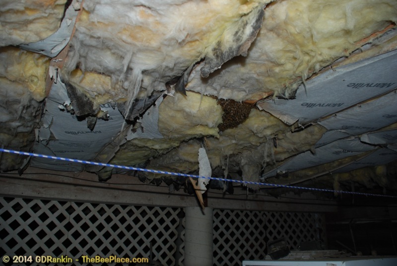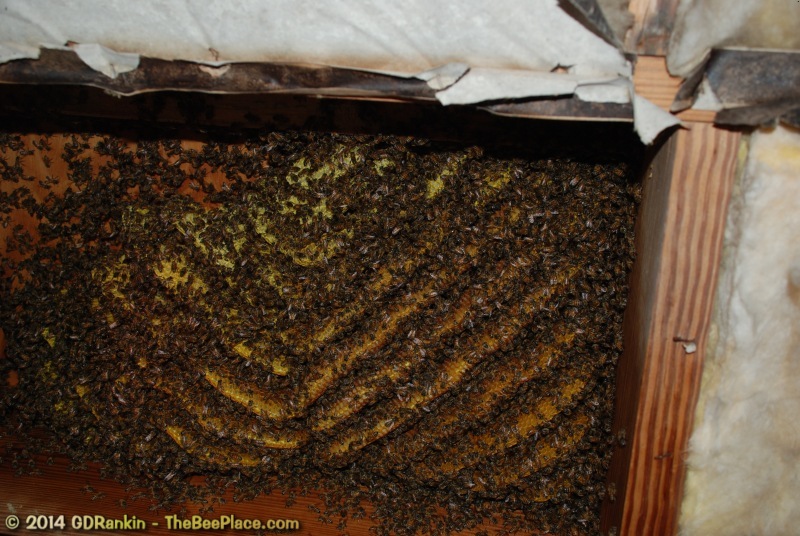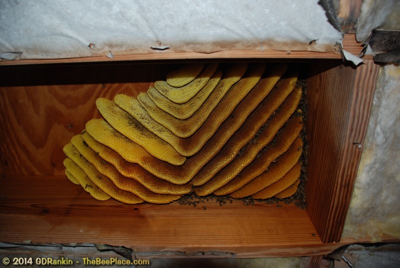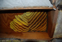 To relocate the bees alive, we carefully removed the comb in sections, including the brood and the honey and place the sections of comb in special frames that fit into a wooden box for transport. Many of the worker bees form clusters around the hive area, in holes and crevices on the inside of the wall. These are vacuumed into the lower section of the BeeVac and held there safely out of harms way. |