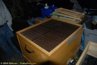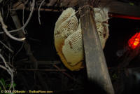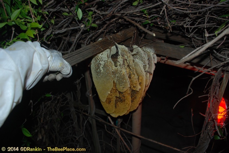 To relocate the bees alive, we carefully removed the comb in sections, including the brood and the honey and place the sections of comb in special frames that fit into a wooden box for transport. Many of the worker bees form clusters around the hive area, in holes and crevices and other hiding places. These are vacuumed into the lower section of the BeeVac and held there safely out of harms way. |