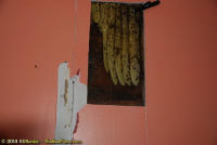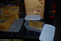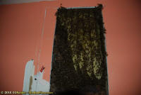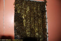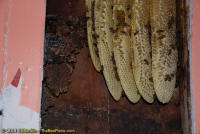 To relocate the bees alive, we carefully removed the comb in sections, including the brood and the honey and place the sections of comb in special frames that fit into a wooden box for transport. Many of the worker bees form clusters around the hive area, in holes and crevices on the inside of the wall. These are vacuumed into the lower section of the BeeVac and held there safely out of harms way. |