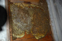 After carefully removing the old lumbar to expose the colony, we carefully removed the comb in sections, including the brood and the honey and place the sections of comb in special frames that fit into a Langstroth style bee hive. Many of the worker bees form clusters around the hive area, in holes and crevices on the inside of the wall. These are vacuumed into the lower section of the BeeVac and held there safely out of harms way.